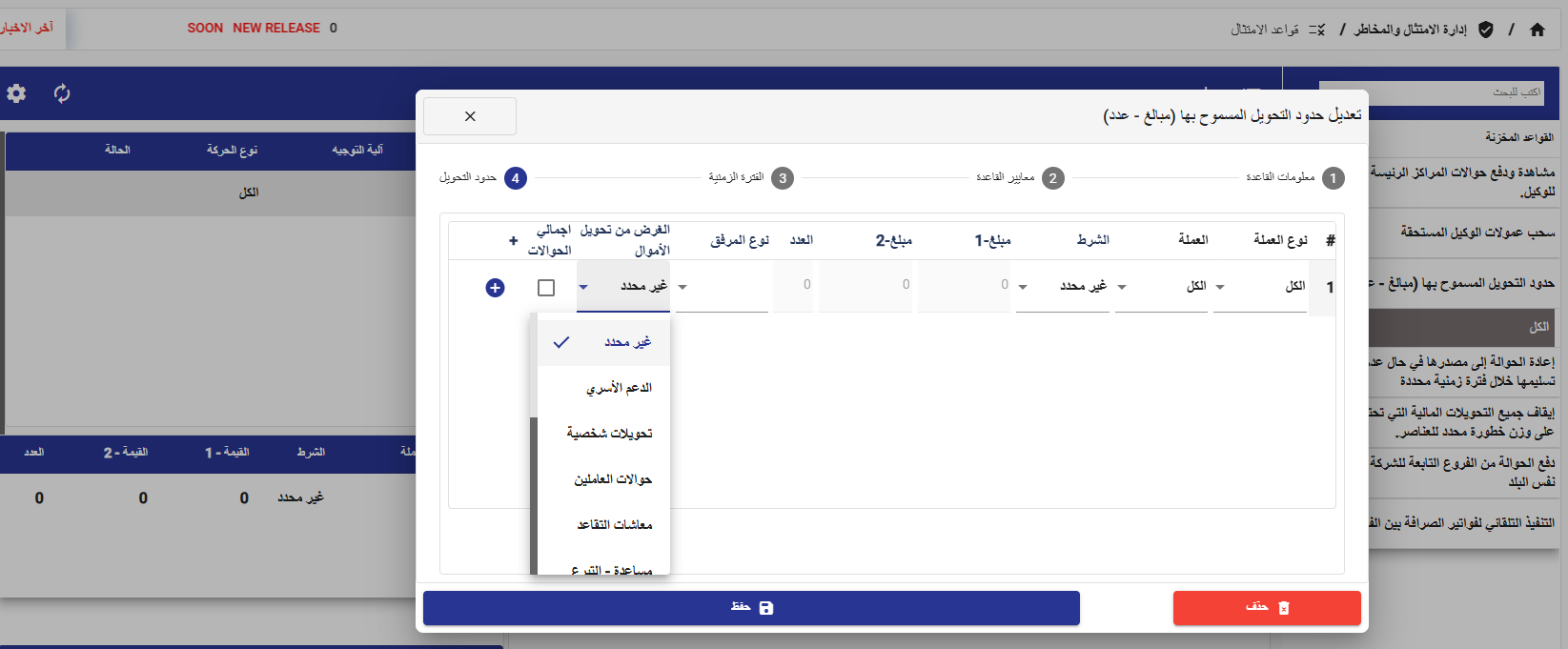 تم دعم إعدادات متقدمة لقاعدة الامتثال حسب سبب التحويل / التصريف، بما يوفّر تحكمًا أدق عند ضبط حدود التحويل المسموح بها. ويشمل ذلك تفعيل القاعدة وتطبيقها مباشرة على فواتير الصرافة وفواتير استبدال العملة، بما يعزز الامتثال ويمنح مرونة أعلى في إدارة الحدود وفق السياسات المعتمدة.