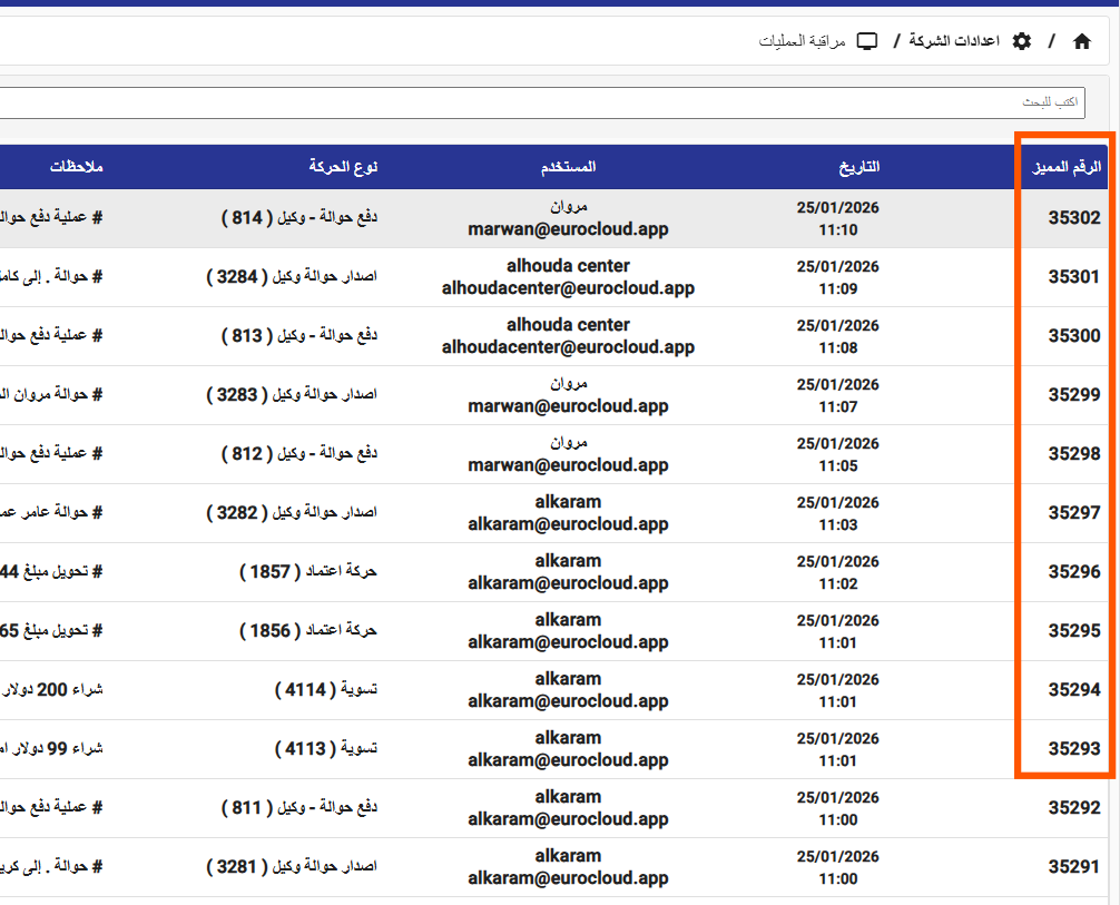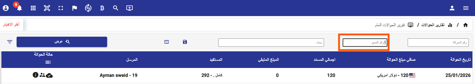 تم إضافة ميزة البحث باستخدام الرقم المميّز للحركة ضمن تقرير الحوالات العام، مما يتيح الوصول السريع والدقيق لأي حوالة محددة، ويعزّز كفاءة المتابعة والتدقيق وتحليل العمليات على مستوى المنصة.