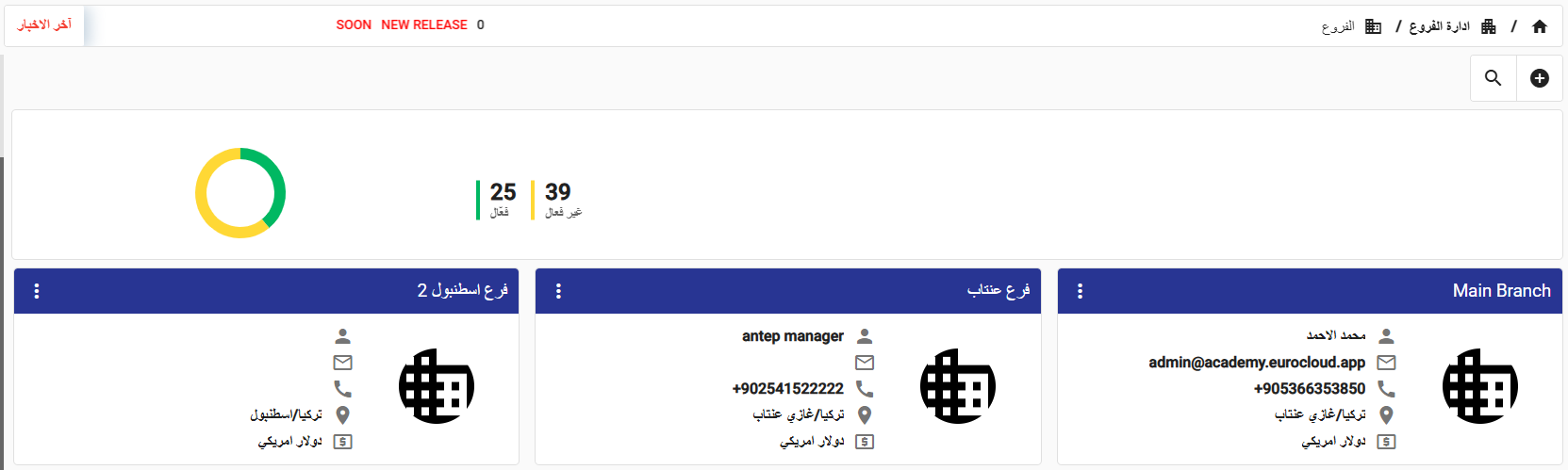 تم تطوير صفحة الفروع عبر إضافة إحصائية توضح عدد الفروع الفعّالة وغير الفعّالة، مما يوفّر رؤية سريعة وشاملة لحالة الفروع ويدعم قرارات الإدارة والمتابعة التشغيلية.