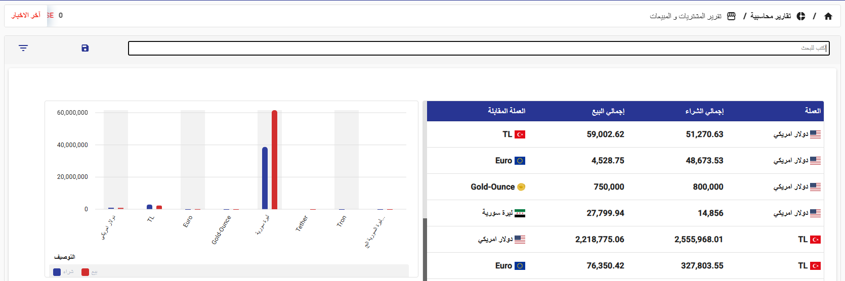 تم تطوير آلية البحث السريع في تقرير المشتريات والمبيعات، مع تفعيل البحث باستخدام الرقم المميّز، مما يسهّل ويُسرّع الوصول إلى فواتير الصرافة بدقة عالية عبر هذا الرقم المرجعي.