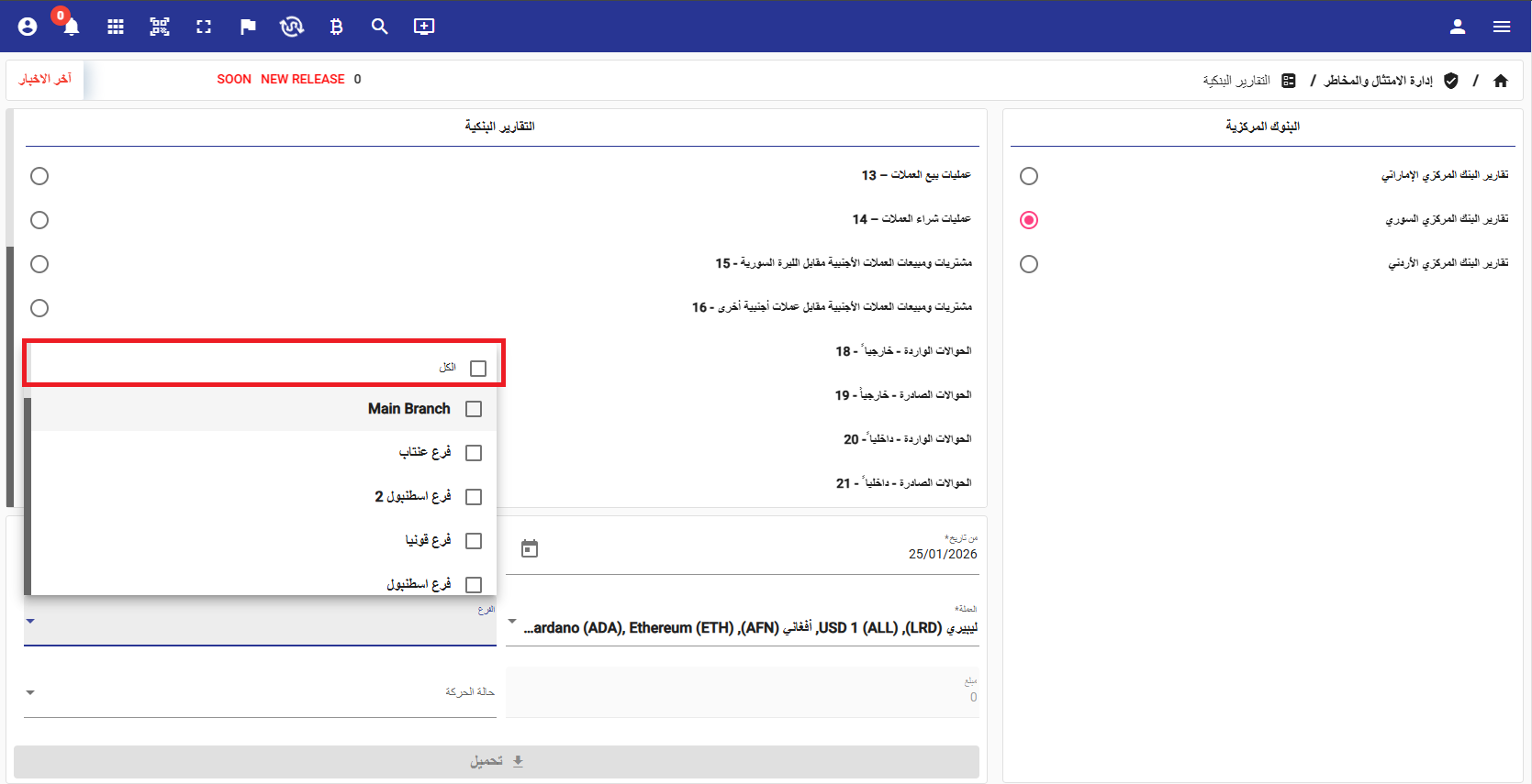 تم تطبيق آلية فلترة الفروع على كافة تقارير البنك المركزي السوري، حيث كان سابقًا يتم جلب البيانات لجميع الفروع، وأصبح الآن عرض البيانات حسب الفرع المحدد فقط.معالجة مشكلة إلغاء فاتورة استبدال العملات: