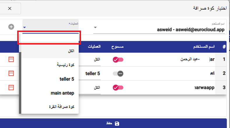 تمت إضافة ميزة البحث ضمن صلاحية اختيار الكوّة لتسهيل وتسريع عملية التخصيص عند ربطها بالمستخدمين، وتحسين تجربة الإدارة والتحكم بالصلاحيات.