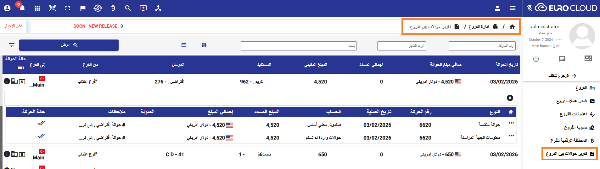 تمت إضافة تقرير جديد خاص بالإدارة العامة في حال وجود فروع متعددة، يتيح استعراض الحوالات بين الفروع لمراقبة العمليات، مع إمكانية فتح أصل الحركة للاطلاع فقط دون السماح بالتعديل.