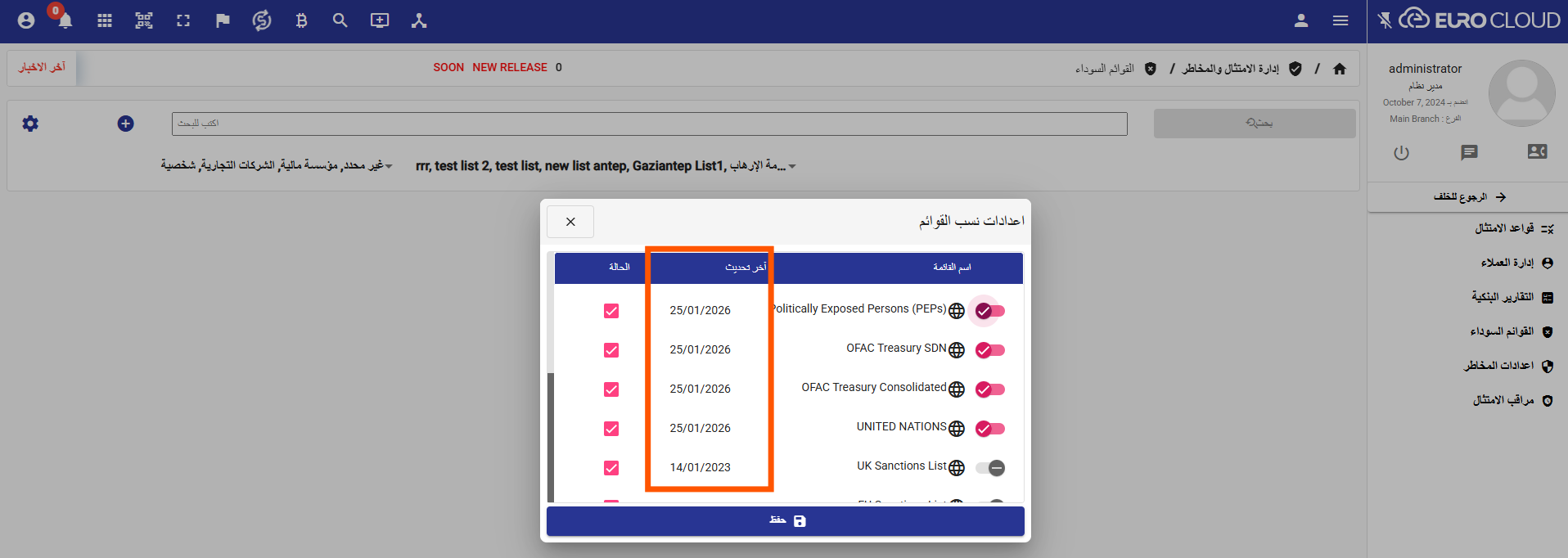 تم إظهار تاريخ آخر تحديث للقوائم السوداء العالمية، بما يتيح متابعة حداثة البيانات المستخدمة في الفحص والامتثال بشكل واضح.