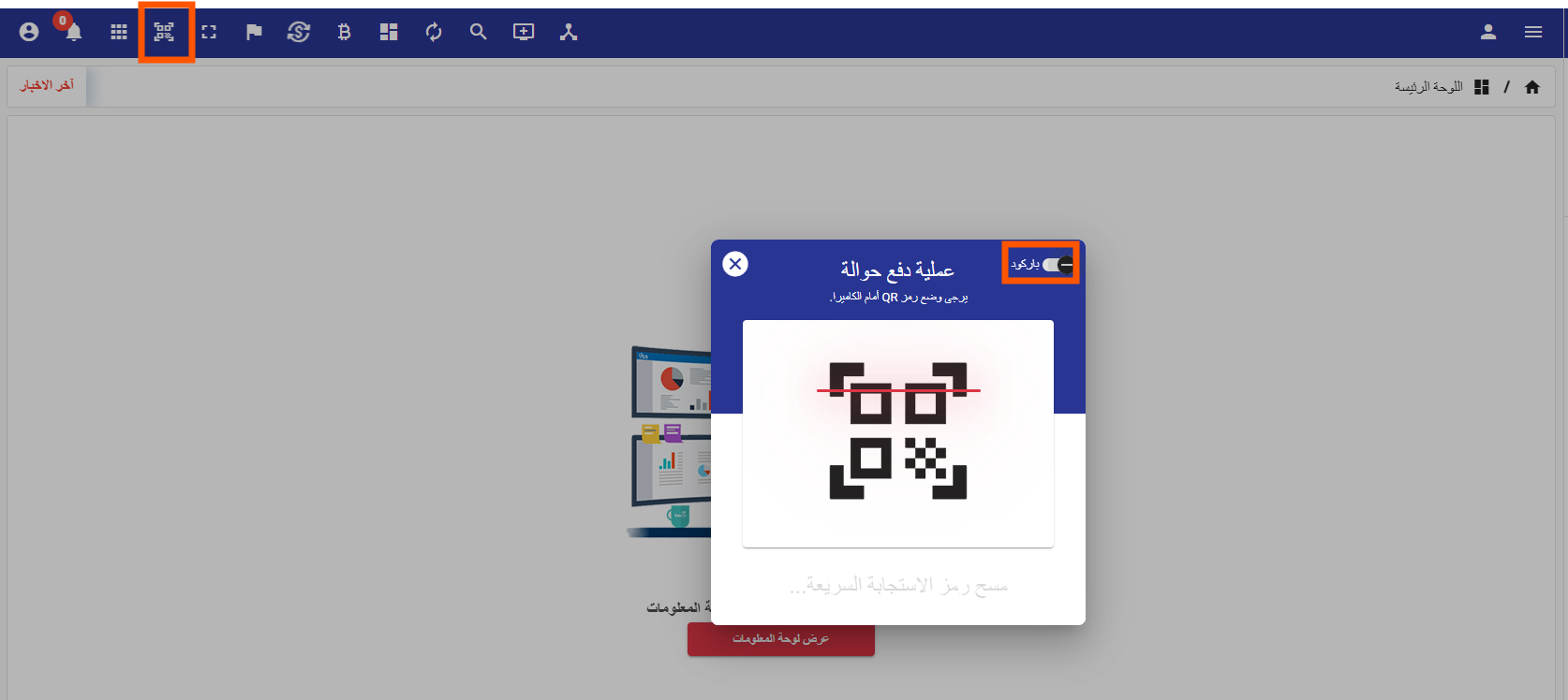 تم تطوير آلية قراءة رمز الاستجابة السريعة (QR) عبر دمج جهاز الباركود للبحث عن عمليات دفع الحوالات، مع إتاحة استخدام كاميرا الحاسوب أو جهاز قارئ الهويات في حال توفره، مما يسرّع الوصول للحركة ويحسّن كفاءة التنفيذ وتجربة الاستخدام.