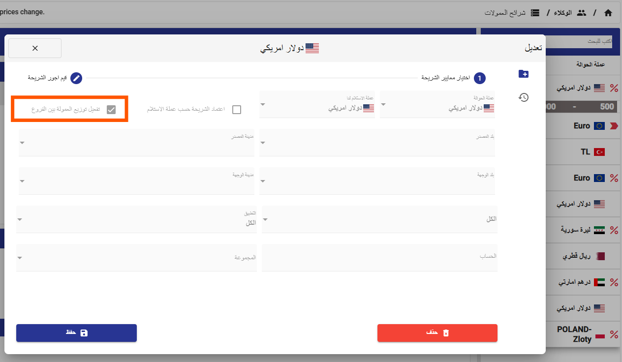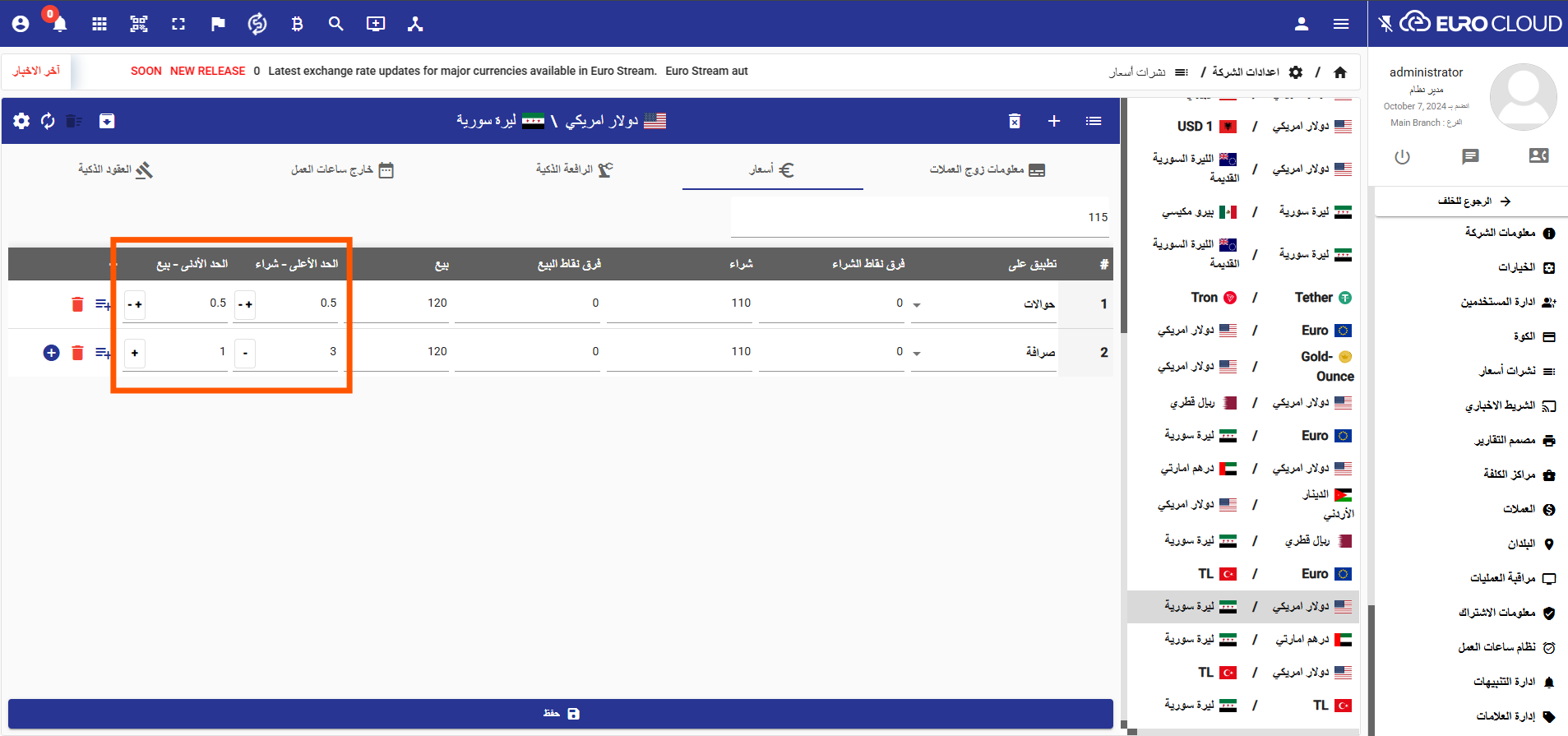 تم معالجة مشكلة كانت تمنع ضبط حدود البيع والشراء لزوج العملات المعمّم عند تفعيل قاعدة تنفيذ الفواتير بين الفروع، حيث كان النظام يعرض رسالة "لا يمكن ضبط الحدود" حتى عند محاولة ضبطها للحوالات.