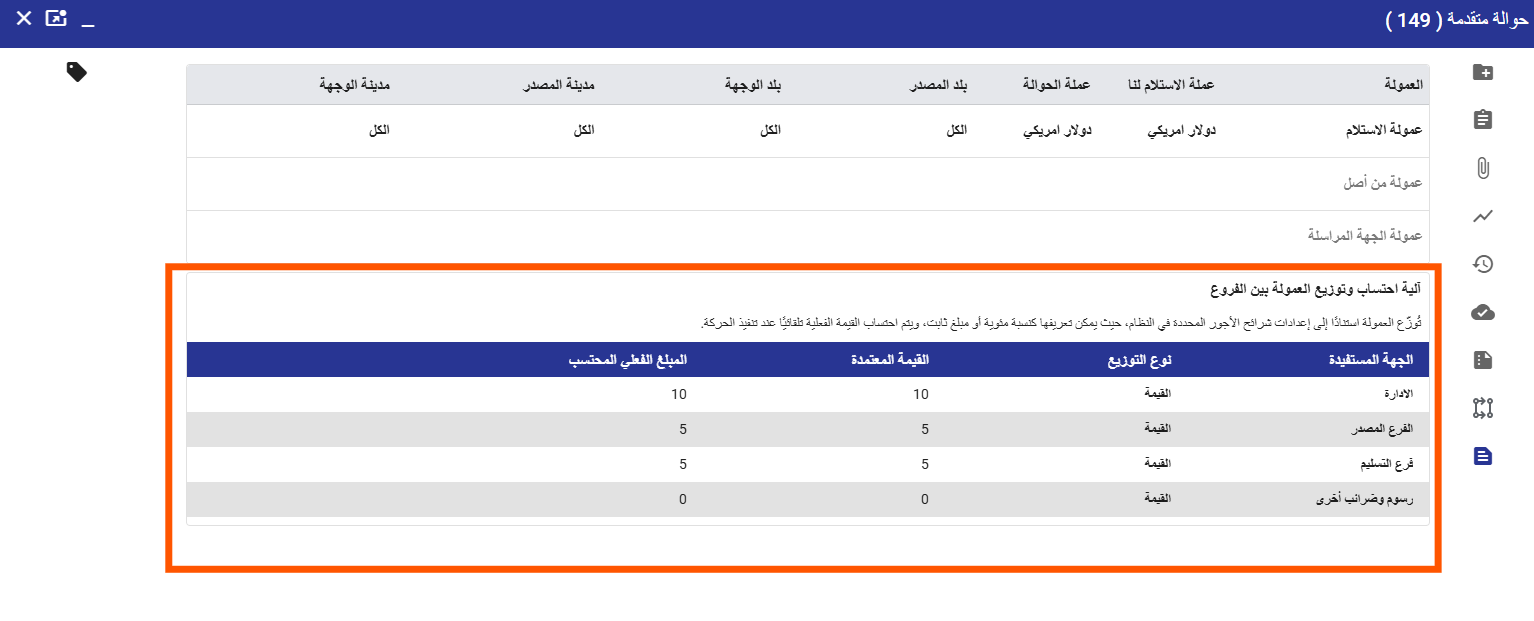 لأغراض الأمان وحماية المعلومات الحساسة، فإن هذه الميزة متاحة فقط لمستخدمي الإدارة العامة، ولا تظهر لباقي الفروع عند عرض تفاصيل الحركة، وذلك لمنع تسريب أي معلومات مالية داخلية تتعلق بتوزيع الإيرادات بين الفروع.
