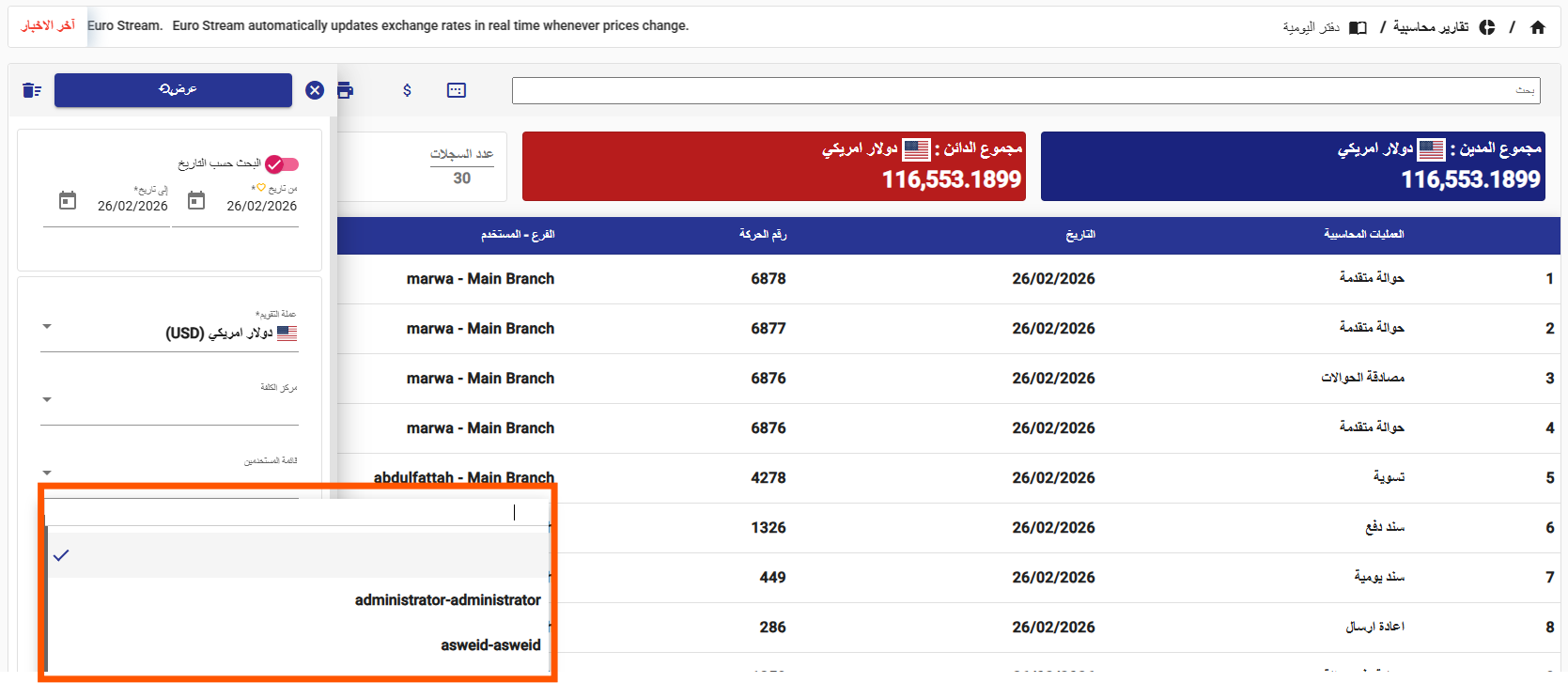 تم تحسين آلية البحث بالمستخدم ضمن فلترة تقرير دفتر اليومية، بما يضمن دقة أعلى في النتائج وسرعة في عرض البيانات عند تحديد المستخدم المرتبط بالحركات.