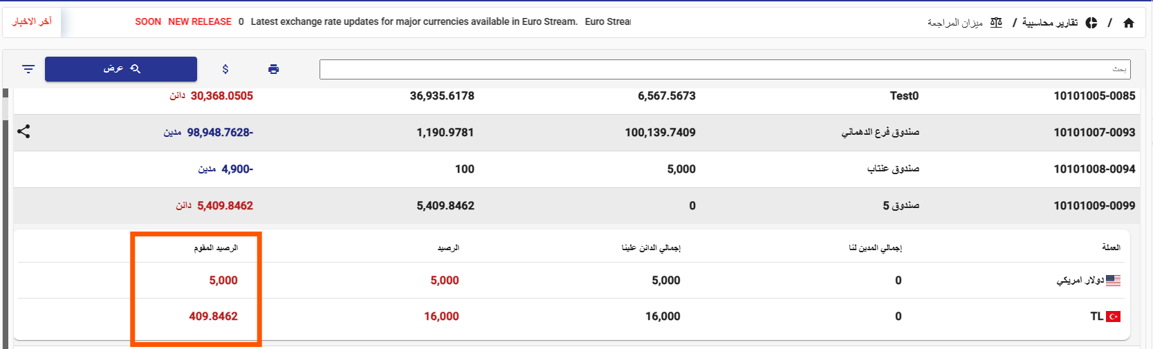 تم إضافة عرض الرصيد المقوّم لكل عملة ضمن تقرير ميزان المراجعة، بما يعزز دقة التحليل المالي في البيئات متعددة العملات.تم تضمين الرصيد المقوّم أيضًا ضمن ملف التصدير، لضمان تطابق البيانات بين العرض داخل النظام والنسخة المصدّرة.