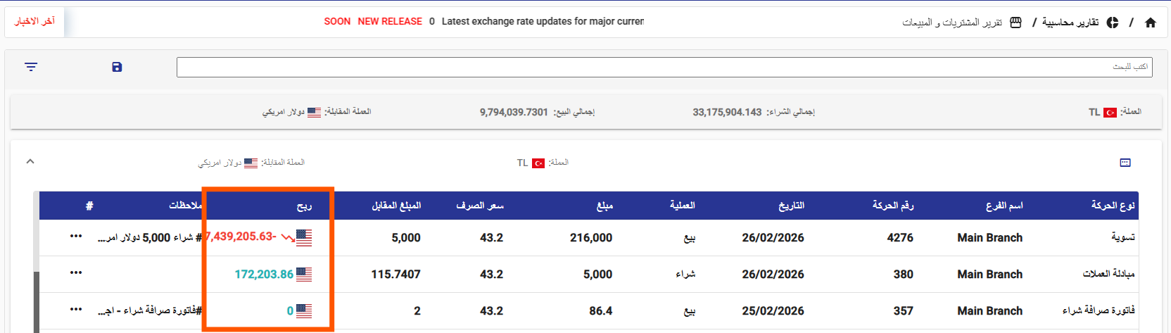 تم تحسين عرض عملة ربح العملية ضمن تقرير مشتريات ومبيعات العملات الأجنبية، بما يوضح بشكل أدق عملة الربح المحقق لكل عملية ويسهّل التحليل المالي.