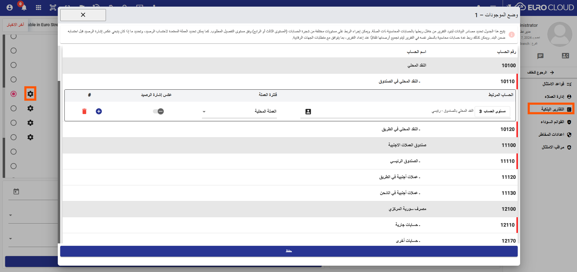 تم إضافة ميزة رمز الحساب الرقابي ضمن شجرة الحسابات، والتي تتيح ترميز الحسابات وفق متطلبات الجهة الرقابية للبنك المركزي مع الحفاظ على ترقيم الحسابات الداخلي الخاص بمنصة Euro Cloud.