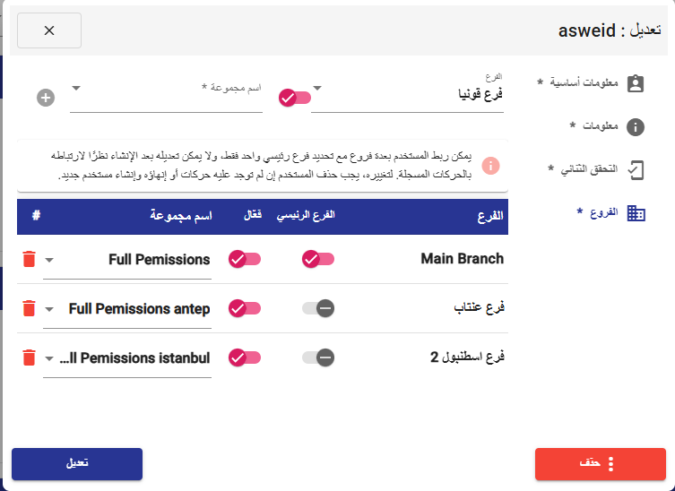 يمكن ربط المستخدم بعدة فروع مع تحديد فرع رئيسي واحد فقط، ولا يمكن تعديله بعد الإنشاء نظرًا لارتباطه بالحركات المسجلة. لتغييره، يجب حذف المستخدم في حال عدم وجود حركات عليه أو إنهاؤه وإنشاء مستخدم جديد.