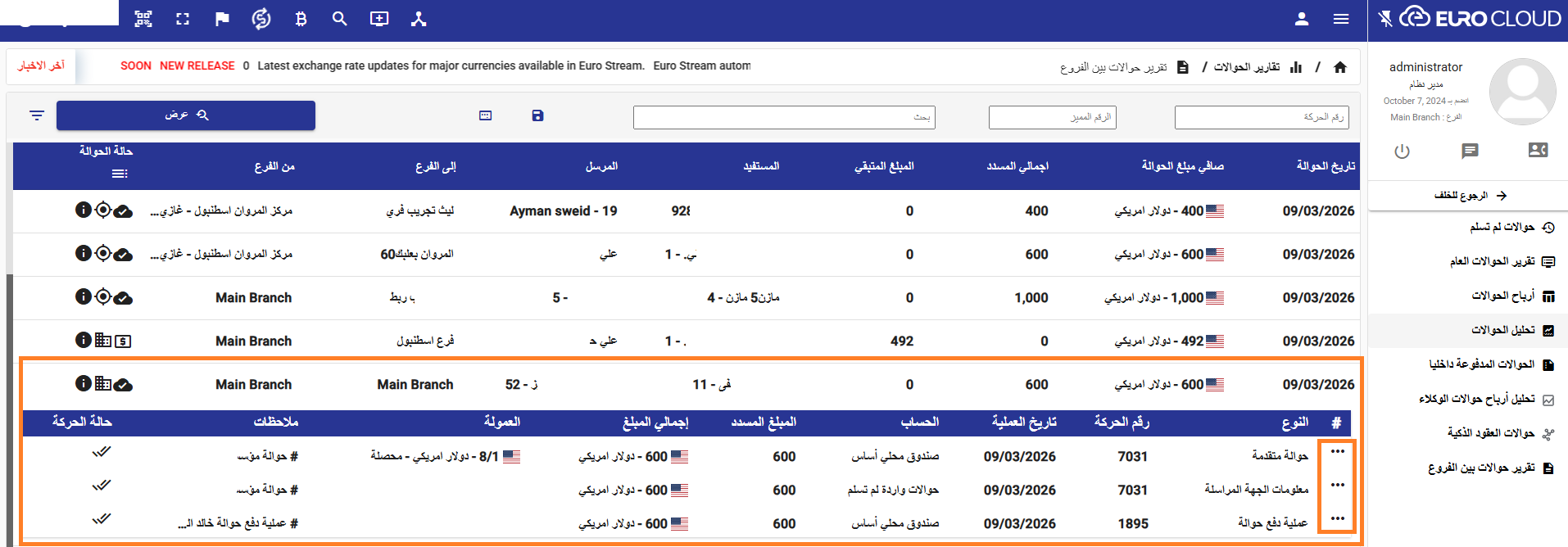 تتيح هذه الميزة لمستخدمي الإدارة متابعة ومراقبة عمليات الحوالات بين الفروع مباشرة من فرع الإدارة دون الحاجة لتسجيل الدخول إلى كل فرع على حدة.