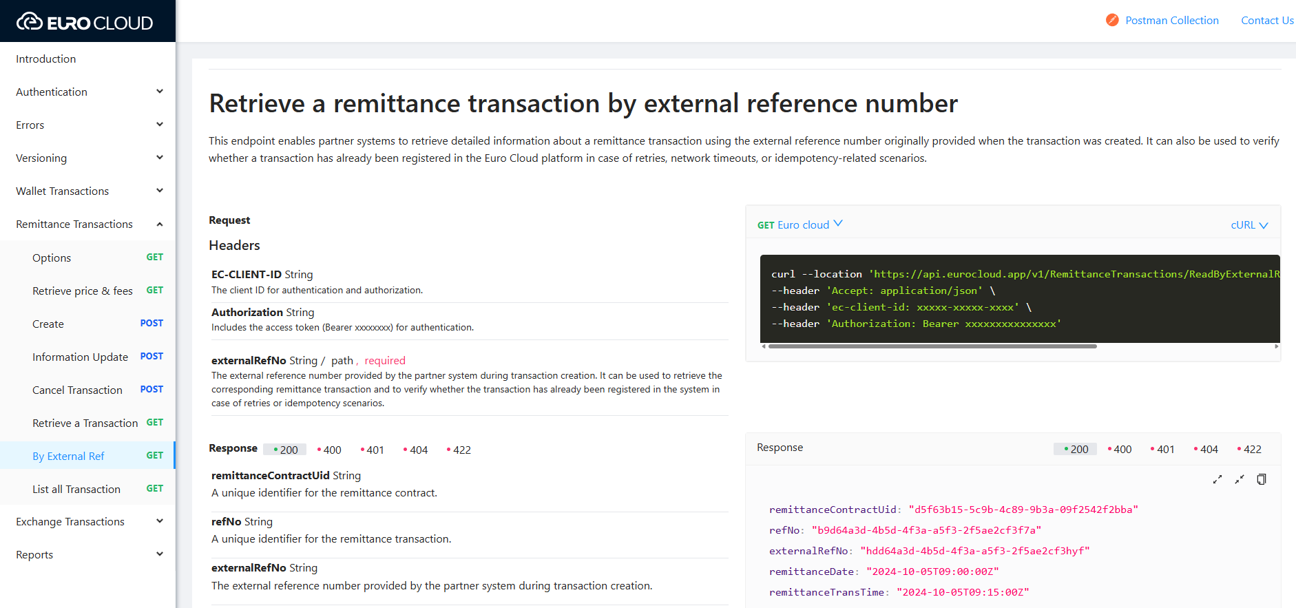 تتيح استرجاع بيانات الحوالة باستخدام الرقم المرجعي الخارجي , تمكّن هذه الواجهة الأنظمة المرتبطة من استعلام تفاصيل الحوالة والتحقق مما إذا كانت العملية قد تم تسجيلها مسبقًا في منصة Euro Cloud، خاصة في حالات إعادة المحاولة أو انقطاع الاتصال أو سيناريوهات Idempotency.