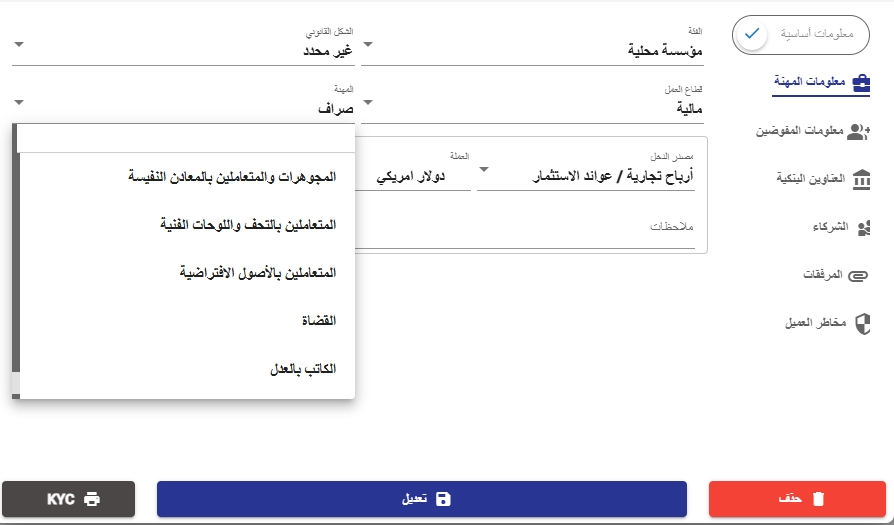 تم إضافة مهن جديدة ضمن قائمة المهنة في بطاقة العميل، وتشمل: